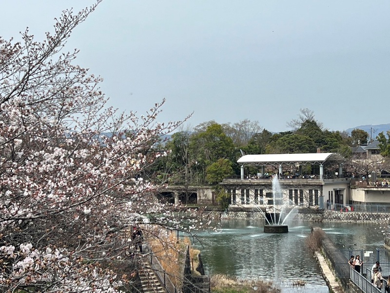 ※後ろの噴水はポンプ(電力)を使わず、琵琶湖からの水の高低差だけで24時間365日出続けています。この水はさらに下流にある水力発電所を100年以上動かして、今も京都の一般家庭100軒に電気を送っています。
